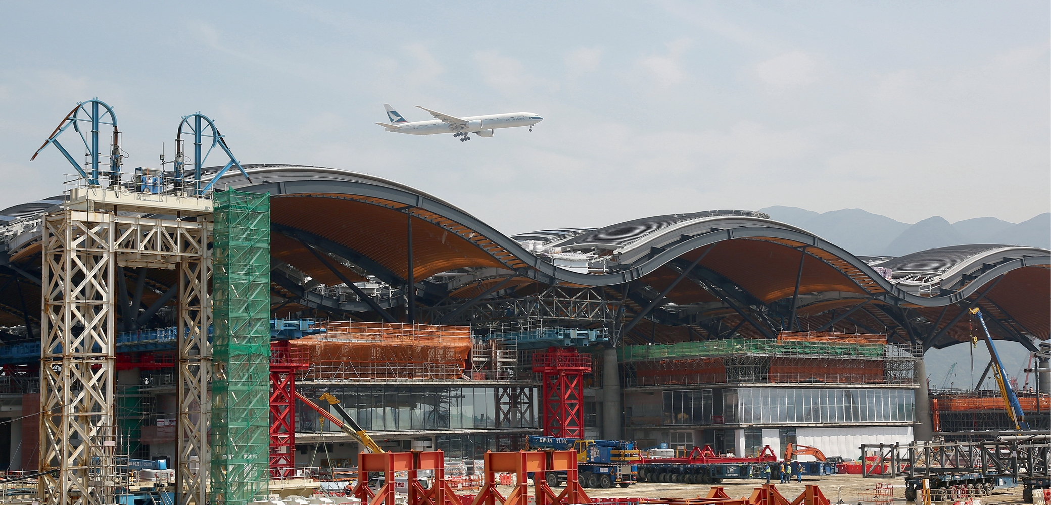 The method allows lifting works to proceed without protruding above the permanent structure, ensuring compliance with airport height restrictions and air-traffic safety requirements.
