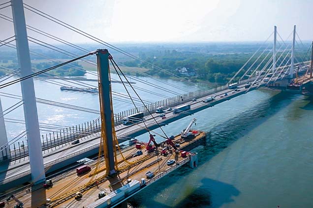 El puente Duisburg-Neuenkamp, de 802 metros de longitud y el puente atirantado de mayor longitud de Alemania, soporta la A40 sobre el Rin cerca de Duisburg. Como parte del proyecto para reemplazar la antigua estructura y duplicar su capacidad, se contrató a VSL Suiza para suministrar e instalar los tirantes, incluyendo los primeros amortiguadores de fricción de Alemania. Para poder desmontar el antiguo puente de forma segura, primero fue necesario retirar las cargas. VSL Suiza se encargó de destensar y retirar 108 tirantes en 54 operaciones a lo largo de seis periodos de cinco días.