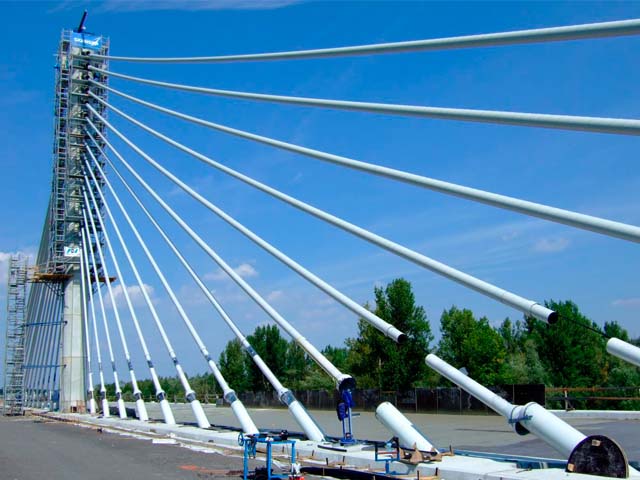 The D1 Motorway Bridge, specifically designed to be an attractive landmark over the Odra River is situated in a recreational area on the outskirts of Ostrava. 28 stay cables to support the bridge deck were installed using the VSL SSI 2000 System.