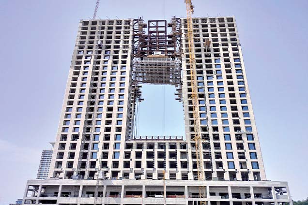 The Four Seasons project in Saudi Arabia required complex heavy lifting to install two multi-storey bridges connecting four towers. VSL executed the operations, lifting a 2,500-tonne north bridge to 65 m and a 1,300-tonne south bridge to 55 m. Selected for its heavy-lifting expertise, VSL designed the lifting concept and ensured precise, controlled installation of these exceptional structural units.