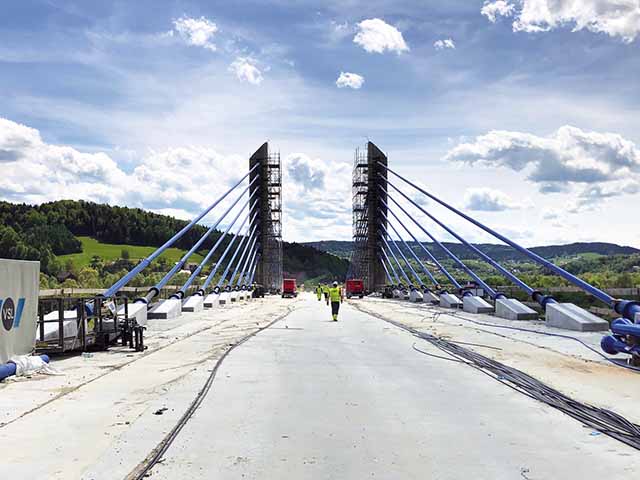 The Kurów Bridge in Poland is one of the three longest extradosed bridges in the country: VSL supplied and installed its stay cable system SSI 2000e with saddles and optimised the pylon shape. One of the key highlights of this project was the installation of all 108 anchorages off-site as part of the segment production. This allowed VSL to optimise the construction schedule and reduce installation costs.