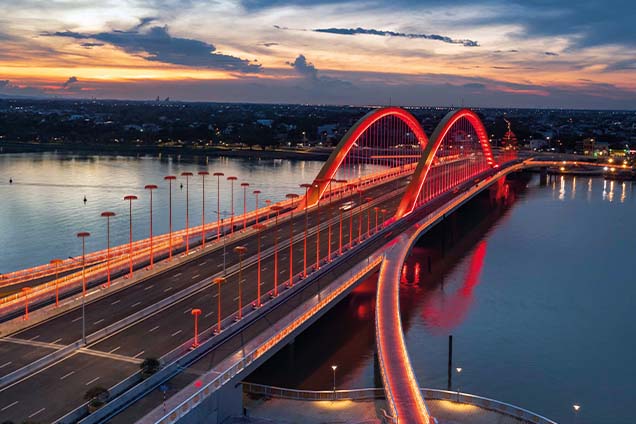 VSL’s involvement in the Nguyen Hoang Arch Bridge in Hue City began at the architectural design competition stage, where the arch bridge proposal was awarded first prize. VSL then provided technical support for the hanger system design, followed by the supply and installation of the cables on site. Hangers were prefabricated to optimise installation, and final tuning was carried out using four 30-tonne jacks. The project marks Vietnam’s first arch bridge application of VSL’s SSI 2000e single-strand system, improving efficiency and long-term maintainability.