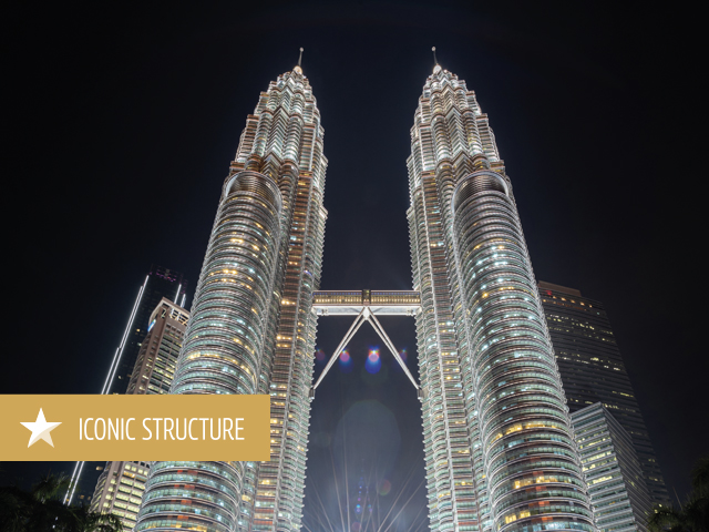 The Petronas Twin Towers in Kuala Lumpur, in Malaysia, have become an international design icon and were the world’s tallest buildings from 1998 to 2004. The towers feature a double-decker skybridge connecting the two buildings at the 41st and 42nd floors.