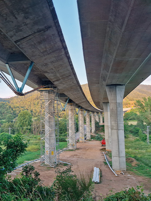 After conducting a special inspection of the 509-metre-long Osormort Viaduct, which revealed severe tendon corrosion threatening structural safety, VSL Spain was contracted to carry out specialist replacement works. This included installing temporary tendons, de-stressing and dismantling existing tendons, temporary/service monitoring, and installing new tendons and replacing pot bearings on the abutments.