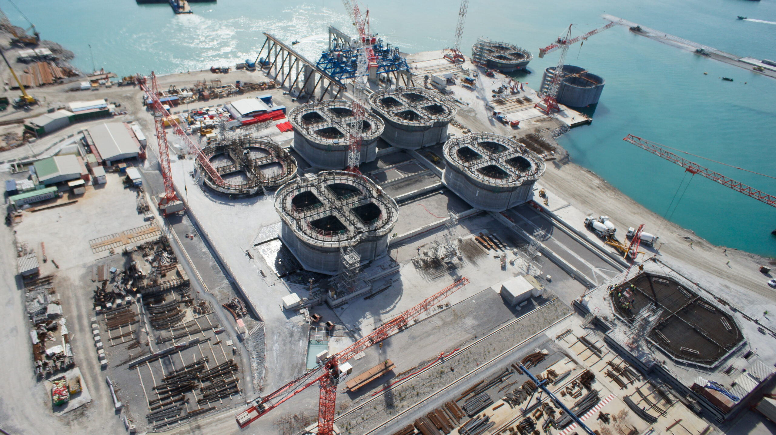VSL was awarded a contract for skidding 70 caissons on site and load out operations for 105 caissons. Three manufacturing lines were used to build the caissons, and each could produce three simultaneously. Each of the lines consisted of three fabrication areas, where VSL provided the complete skidding system to move 70 caissons from one area to another at manufacturing lines 1 and 2. VSL Heavy Lifting supplied items of equipment such as skidding track lines, Teflon pads, skid shoes and hydraulic jacks, monitoring systems, pumps and push and pull units. After the first launch, VSL Heavy Lifting was able to carry out a complete cycle- skidding the empty gantry, picking up the next caisson, skidding it, transferring it into the water and moving the gantry back to pick up the next one, all in less than 12 hours. VSL managed to complete the work as exactly scheduled, when all 105 caissons were successfully moved into the water.